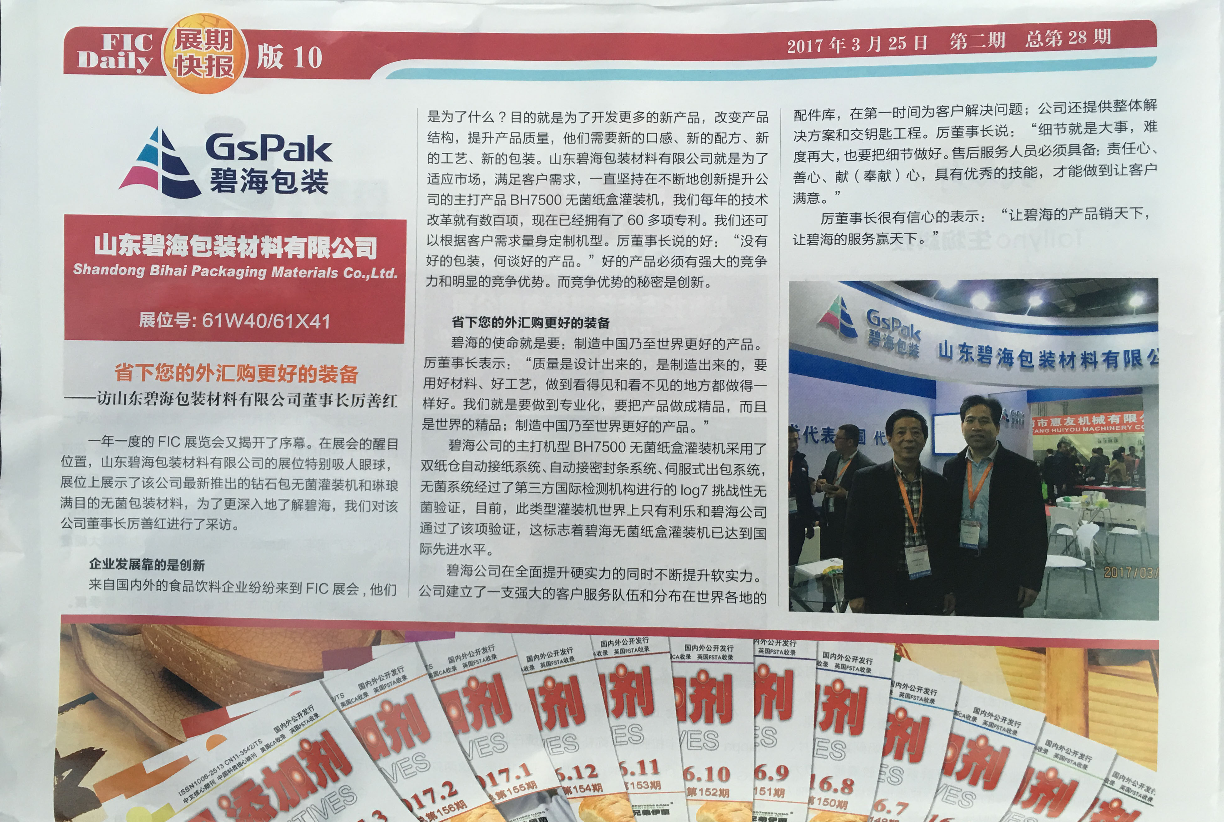 一年一度的FIC展覽會(huì)又揭開(kāi)了序幕。在展會(huì)的醒目位置,山東碧海包裝材料有限公司的展位特別吸人眼球,展位上展示了該公司最新推出的鉆石包無(wú)菌灌裝機(jī)和琳瑯滿目的無(wú)菌包裝材料,為了更深入地了解碧海,我們對(duì)該公司董事長(zhǎng)厲善紅進(jìn)行了采訪。