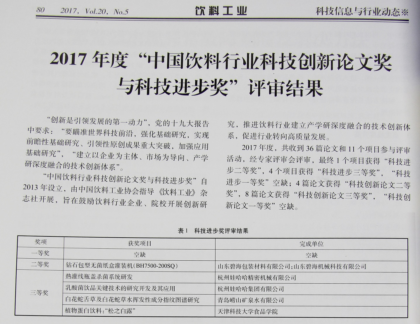 2017年11月21-24日,中國飲料工業(yè)協(xié)會年會、第八屆中國國際飲料工業(yè)科技展、“2017中國飲料行業(yè)科技創(chuàng)新論文獎與科技進步獎”頒獎活動在上海新國際博覽中心同期舉行,經(jīng)中國飲料工業(yè)協(xié)會評定,我公司的《鉆石包型無菌紙盒灌裝機(BH7500-200SQ)》項目榮獲“中國飲料行業(yè)科技進步獎”二等獎。
